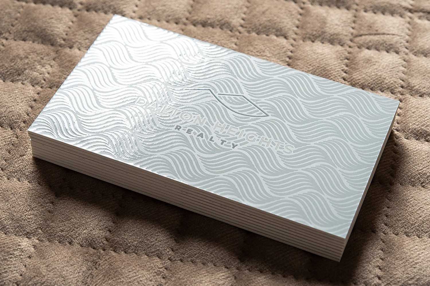 凹凸名片:做擊凸擊凹效果名片,選擇合適的紙很重要,一般建議采用比較蓬松略厚的高檔特種紙為好,可咨詢客服了解或索取紙樣。