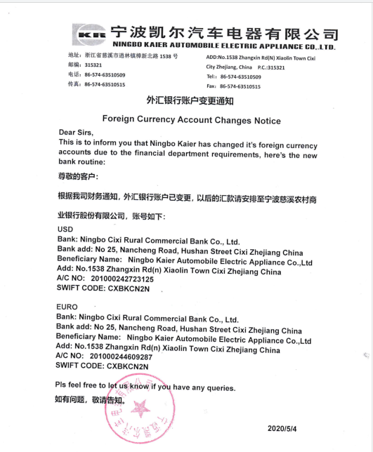 尊敬的客戶: 根據我司財務通知,外匯銀行賬戶己変更,以后的,以后的匯款請安排至寧波慈溪農村商業(yè)銀行股份有限公司